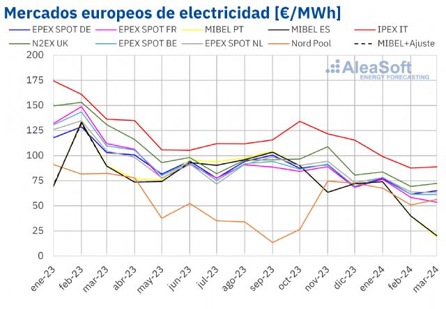 En el primer trimestre de 2024, el precio promedio trimestral se mantuvo por debajo de 70 €/MWh en la mayoría de los principales mercados eléctricos europeos. Las excepciones fueron el mercado N2EX del Reino Unido y el mercado IPEX de Italia, cuyos promedios fueron 75,25 €/MWh y 91,98 €/MWh, respectivamente. Por otra parte, el mercado MIBEL de Portugal y España registró los precios trimestrales más bajos, de 44,52 €/MWh y 44,92 €/MWh, respectivamente. En el resto de los mercados analizados en AleaSoft Energy Forecasting, los promedios estuvieron entre los 58,48 €/MWh del mercado Nord Pool de los países nórdicos y los 68,50 €/MWh del mercado EPEX SPOT de los Países Bajos.