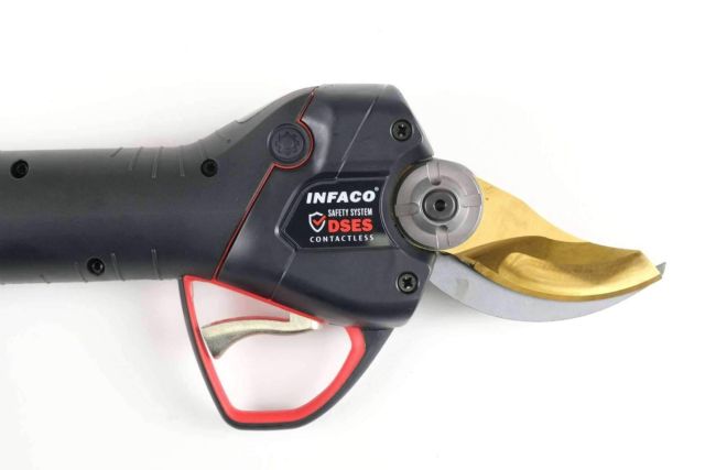 Con la conocida marca Infaco se presenta por primera vez en España el nuevo sistema anti corte de las tijeras de podar eléctricas Electrocoup F3020 “DSES Contactless”. Un novedoso sistema de protección para el trabajador cuando utiliza la tijera de podar eléctrica F3020. Este nuevo sistema incorpora la tecnología Bluethooth, adaptable para todas las tijeras F3020 este sistema integra un receptor en la tijera y un emisor que se instala en un guante diseñado exclusivamente para este sistema anti corte se consigue que al acercar la mano que lleva al guante a unos centímetros de la tijera, esta detecta la mano y procede a abrirse y pararse, hasta que el usuario no separa la mano de la tijera no vuelve a trabajar.