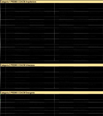 Las categorías que cuentan con más proyectos o propuestas presentadas a concurso son la Categoría 1, correspondiente al Premio COACM de Arquitectura Obra Nueva, al que podían presentarse trabajos de obra nueva, vivienda, intervención en edificios existentes y arquitectura interior; y la Categoría 3, el Premio COACM Emergente, para arquitectos menores de 40 años.