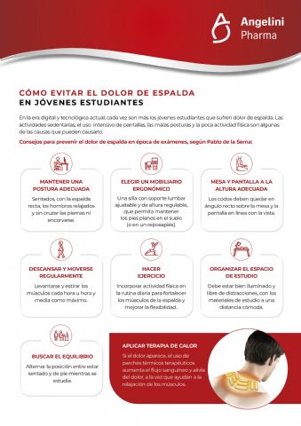 Y entonces es cuando aparece el dolor de espalda, "que no solo afecta el bienestar físico de los estudiantes, sino que también puede tener un impacto negativo en su rendimiento académico y su calidad de vida en general", advierte el experto, colaborador de Angelini Pharma. Además, "la incomodidad constante puede dificultar la concentración, lo que a su vez puede afectar su capacidad para aprender y retener información".