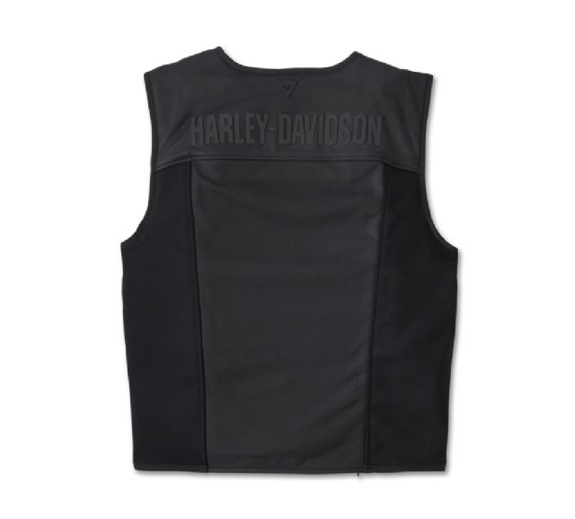 Tanto el Smart Vest de Harley-Davidson® para hombre (P/N 98017-24VM, tallas S a 2XL) como el Smart Vest de Harley-Davidson® para mujer (P/N 98021-24VW, tallas XS a 2XL) cuentan con una capa perforada de piel de vacuno negra de alto gramaje para un flujo de aire fresco y paneles laterales elásticos para una comodidad superior. Ambos diseños incorporan bolsillos para calentadores de manos, con cremallera, material reflectante 3M™ Scotchlite™ Black Carbon para mejorar la visibilidad nocturna y la marca Harley-Davidson en relieve en la parte trasera de los hombros. El fino diseño limita el volumen, y el chaleco se puede llevar por debajo o por encima de una chaqueta de conducción (si se lleva por debajo, dejar unos cinco centímetros de espacio en caso de despliegue).