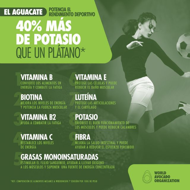 Los aguacates destacan por sus altos niveles de grasas monoinsaturadas, que no sólo son una gran fuente de energía, sino que también favorecen el flujo sanguíneo, ayudan a transportar oxígeno a los músculos y pueden ayudar a reducir la inflamación. Las vitaminas del grupo B ayudan a convertir los alimentos en energía, mientras que la vitamina C ayuda a combatir la fatiga y aumenta los niveles de actividad. Además, el aguacate contiene luteína, que protege las articulaciones y los cartílagos; biotina, que ayuda a mantener los niveles de energía y es esencial para el crecimiento y la reparación muscular; y potasio, que contribuye al funcionamiento de los músculos y puede ayudar a combatir los calambres. Esta fruta rica en fibra, no sólo ayuda a mantener el buen funcionamiento del intestino, algo necesario para cualquier deportista, sino que también contribuye a reducir el cansancio, después de una dura sesión de entrenamiento.
