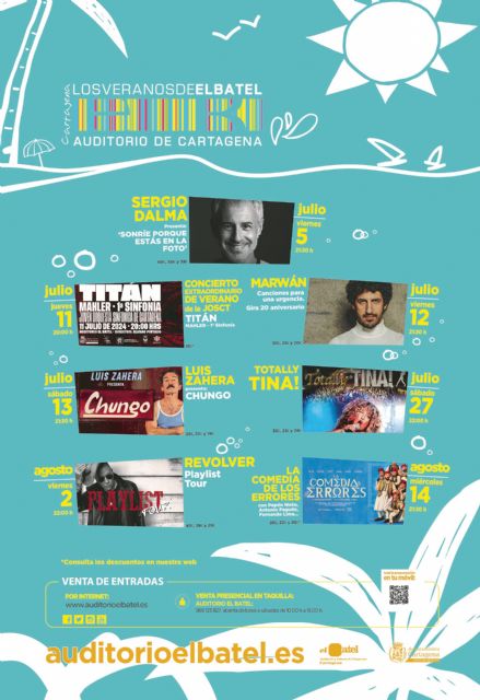 El Auditorio El Batel presenta al completo la programación estival de 'Los Veranos de El Batel'. Entre los meses de julio y agosto, pasarán por el escenario del auditorio de Cartagena Sergio Dalma, la Joven Orquesta Sinfónica de Cartagena (JOSCT), el cantante Marwán, el actor Luis Zahera, con su monologo de humor 'Chungo', el tributo 'Totally Tina!', la banda Revolver y la comedia teatral 'La comedia de los errores', con Pepón Nieto encabezando el elenco.