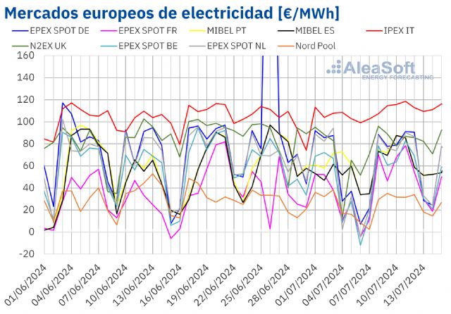 En la segunda semana de julio, los precios de los mercados eléctricos europeos subieron respecto a la semana anterior. Estas subidas estuvieron favorecidas por la caída de la producción eólica y el incremento de las temperaturas, que provocó la subida de la demanda en gran parte de los mercados. En casi todos los mercados se registraron precios negativos en algunas horas. La fotovoltaica registró récords históricos en España y Portugal, y récords para un mes de julio en Francia y Alemania