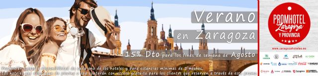Esta nueva promoción ofrece descuentos del 15% (estancia mínima 2 noches) durante todos los fines de semana de agosto (del 2 al 4, del 9 al 11, del 16 al 18; del 23 al 24 y del 30 agosto al 1 septiembre) con acceso libre a la piscina y/o spa en los establecimientos que dispongan de ello. Este año, la campaña permite escoger estancia en 15 establecimientos de Zaragoza capital y otros 4 en diferentes puntos de la provincia: Hotel Ibis Styles Zaragoza Ramiro I; Hotel Río Arga; Hotel Oriente; Hotel Vincci Zaragoza Zentro,Hotel Alfonso, Hotel Palafox, Hotel Reina Petronila, Hotel Hiberus, Sercotel Hotel Plaza Feria,Hotel Diagonal Plaza, Hotel Goya, Hostal Plaza Boutique, Hotel Inca Boutique, Hotel Pilar Plaza, Hotel SPA Real Ciudad de Zaragoza, Complejo Rural Lifara (Añinón), Hotel Europa (Utebo), Hotel Las Coronas (Sos del Rey Católico), Hotel Restaurante Chané (La Puebla de Alfinden).