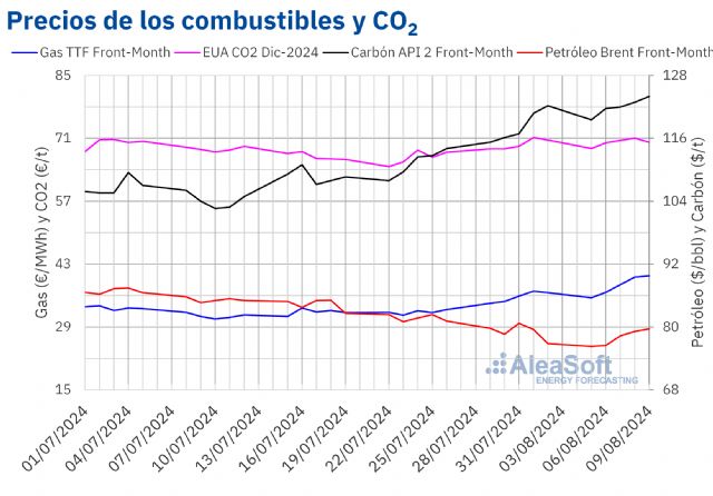 Por lo que respecta a los precios de cierre de los futuros de derechos de emisión de CO2 en el mercado EEX para el contrato de referencia de diciembre de 2024, subieron en casi todas las sesiones de la segunda semana de agosto. El promedio semanal de los precios de cierre fue un 0,6% mayor que el de la semana del 29 de julio. El precio de cierre del lunes 5 de agosto, de 68,73 €/t fue el de menor valor de la semana, un 2,6% menor que el de la última sesión de la semana anterior. Los siguientes días los precios continuaron subiendo hasta el jueves 8 de agosto cuando el precio de cierre se situó en 71,06 €/t. Aunque inicialmente estos precios siguieron la estela de los precios del gas, el viernes 9 de agosto el precio de cierre bajó hasta los 70,14 €/t, un 0.6% inferior al del viernes de la semana anterior.