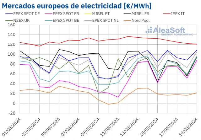 Durante la semana del 12 de agosto, los mercados de los Países Bajos, Bélgica y Alemania registraron horas con precios negativos. El mercado neerlandés registró precios negativos en algunas horas de los días 12 y 15 de agosto, siendo el precio más bajo de la semana, de -10,06 €/MWh entre las 14:00 y las 15:00 del 12 de agosto. El mercado alemán registró un precio negativo de -0,04 €/MWh el 15 de agosto entre las 14:00 y las 15:00, mientras que en el mercado belga los precios negativos sucedieron el domingo 18 de agosto entre las 15:00 y las 17:00, de -5,48 €/MWh y -0,38 €/MWh, respectivamente. El mercado ibérico registró precios de 0 €/MWh entre las 10:00 y las 17:00 del 15 de agosto y las 11:00 y 18:00 del 18 de agosto.