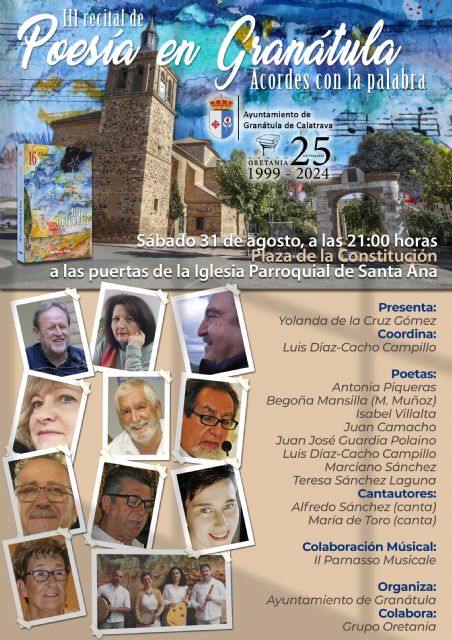 El acto tendrá lugar en el pórtico de la iglesia parroquial dedicada a Santa Ana, el sábado, 31 de agosto, a partir de las 21:00 horas. Presentado por Yolanda de la Cruz Gómez, está coordinado por el poeta solanero Luis Díaz-Cacho y se contará con la participación, en la categoría de poetas, de Antonia Piqueras, Isabel Villalta, Juan Camacho, Juan José Guardia Polaino, Luis Díaz-Cacho Campillo, Marciano Sánchez, Teresa Sánchez Laguna y la rapsoda Begoña Mansilla, quien recitará poemas de Manuel Muñoz Moreno. En el apartado de cantautores participarán Alfredo Sánchez y María de Toro. También se contará con la colaboración musical de Il Parnasso Musicale. Organizado por el Ayuntamiento de Granátula de Calatrava, cuenta con la colaboración del Grupo Oretania.