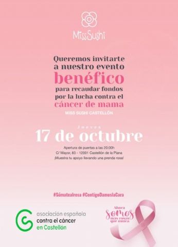 Miss Sushi Castellón celebra en su local de Carrer Major, 83, su ya tradicional evento benéfico con motivo del Día Mundial Contra el Cáncer de Mama, el jueves 17 octubre a partir de las 20.00h. En colaboración con la Asociación Española Contra el Cáncer en Castellón, tiene como misión y deseo recaudar fondos para apoyar la investigación y los programas de asistencia a mujeres afectadas por esta enfermedad.
