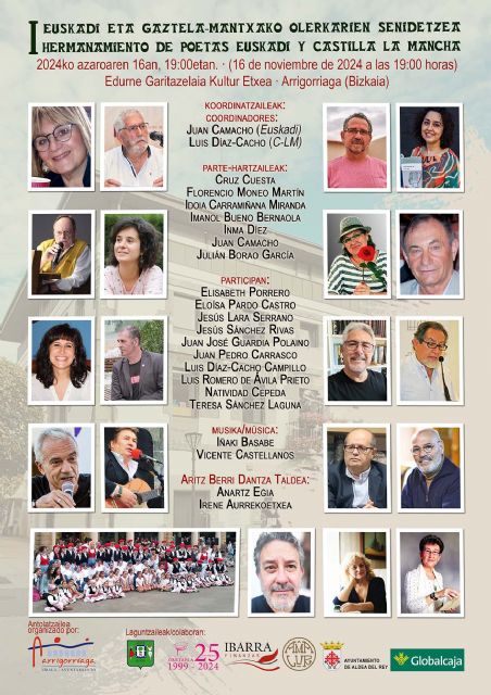 El próximo sábado, 16 de noviembre de 2024, a las 19:00 horas, en la Casa de Cultura 'Edurne Garitazelaia' de Arrigorriaga (Bizkaia), tendrá lugar el acto de hermanamiento entre poetas de Euskadi y Castilla-La Mancha. Organizado por el ayuntamiento de Arrigorriaga, se cuenta con la colaboración del Grupo Oretania, del Ayuntamiento de Aldea del Rey (Ciudad Real), Globalcaja e Ibarra Finanzas. Además del apoyo de la librería Amalur, quienes, además de difundir el evento, se encargarán de la venta de los libros, que ha editado el Grupo Oretania, y que recogen los poemas y canciones de todos los participantes.