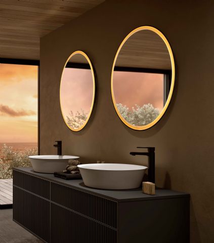 El nuevo espejo Niza propone una original trasera decorativa, que recoge y proyecta frontalmente la luz, creando un halo de iluminación perimetral. Su marco de poliuretano ofrece la posibilidad de combinar diferentes tonos en la cara interna y externa, dando lugar a un modelo muy versátil que ofrece diferentes combinaciones de acabados. Y además se pueden integrar dos tipos de diseño para la luna: una luna volada con la que sumar encanto estético o una luna arenada con la que aportar mayor sensación de luminosidad.