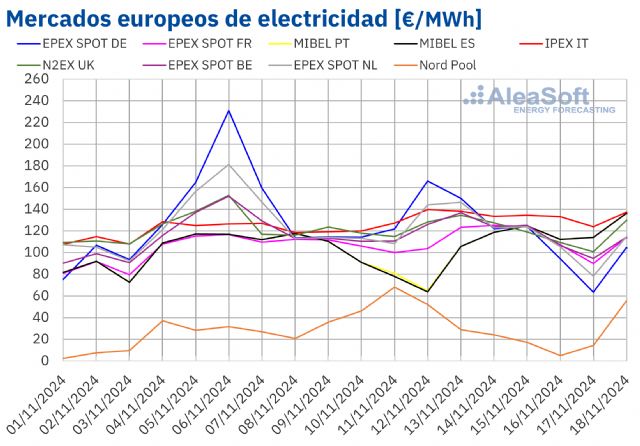 Por lo que respecta a los precios diarios, el lunes 11 de noviembre el mercado nórdico alcanzó su precio más alto desde el 27 de abril de 2024, de 68,17 €/MWh. El jueves 14 de noviembre el mercado francés registró un precio de 125,10 €/MWh, el mayor de este mercado desde el 7 de diciembre de 2023. En el caso de los mercados español y portugués, el lunes 18 de noviembre el precio fue de 136,37 €/MWh, que fue su precio más alto desde el 17 de octubre de 2023.