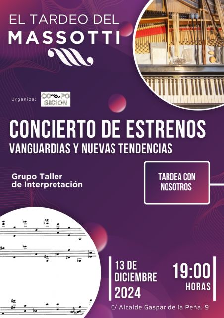 El Conservatorio Superior de Música de Murcia (CSMM) presenta la tercera sesión de "El Tardeo del Massotti", una propuesta innovadora que convierte las tardes de los viernes en una experiencia musical única, que servirá para cerrar el programa de este año 2024.