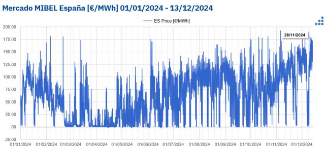 Desde el 26 de noviembre, el mercado eléctrico MIBEL de España ha registrado los precios más altos del año 2024. Analizando la serie de precios hasta el 13 de diciembre, el día 12 se alcanzó el valor máximo del año, de 146,67 €/MWh, seguido por los 143,73 €/MWh registrados un día después, el 13 de diciembre. Durante ese período, los precios diarios superaron los 120 €/MWh, salvo entre el 6 y 9 de diciembre, cuando descendieron debido a una menor demanda eléctrica asociada a los festivos nacional y regional del 6 y 9 de diciembre, así como al fin de semana. Este descenso coincidió, además, con una mayor producción eólica en esos días.