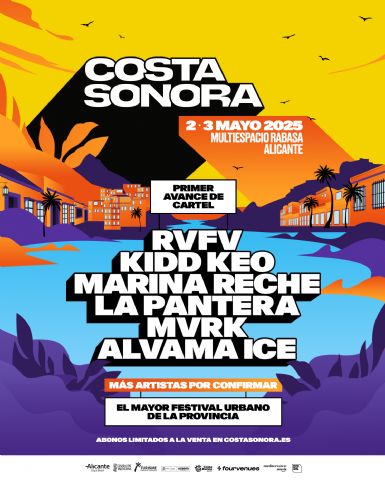 El cartel de Costa Sonora 2025 ofrecerá los conciertos de los artistas más importantes del género, con un cartel único a nivel nacional. Será el primer gran festival de la temporada, dando el pistoletazo de salida a la temporada de festivales, aprovechando el buen tiempo de mayo en la Costa Blanca y la festividad por el puente del trabajador.