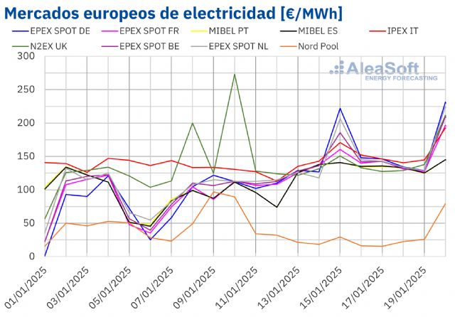 En la tercera semana de enero, los precios de la mayoría de los principales mercados eléctricos europeos subieron, impulsados por la menor producción eólica, el aumento de la demanda debido a temperaturas más frías y el alza de los precios del gas y CO2. El 17 de enero, los futuros del CO2 alcanzaron el precio de cierre más alto desde finales de mayo. La producción solar fotovoltaica aumentó, marcando récords históricos para un día de enero en España, Portugal y Francia