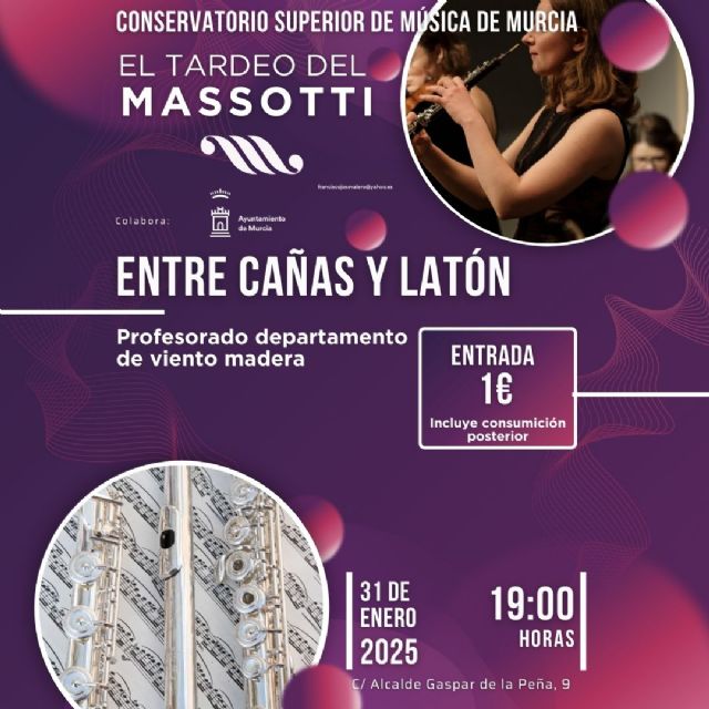 El Conservatorio Superior de Música de Murcia inicia el año con fuerza y entusiasmo presentando "Entre cañas y latón", el cuarto concierto del exitoso programa "El Tardeo del Massotti", que desde su inicio en octubre de 2024 se ha consolidado como una cita imprescindible para los amantes de la música en la región. Este evento mensual, diseñado para transformar las tardes de los viernes en encuentros culturales únicos, tendrá lugar el próximo 31 de enero a las 19:00h en las instalaciones del Conservatorio, situado en la calle Alcalde Gaspar de la Peña, 9.