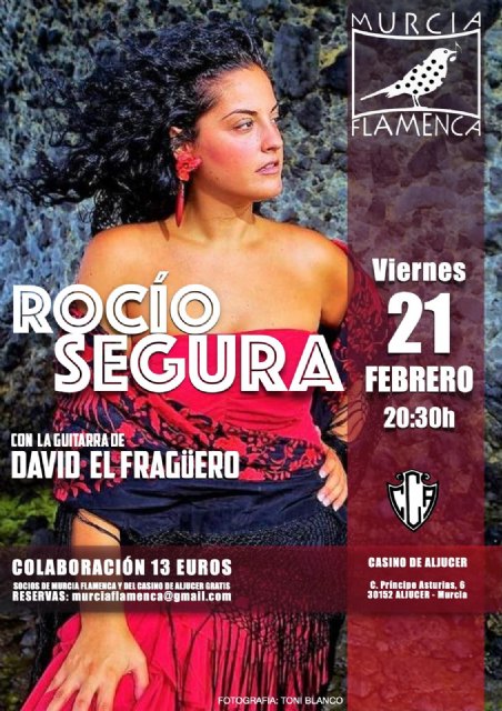Rocío Segura actuará para Murcia Flamenca el viernes 21 de febrero a las 20:30h con la guitarra de David el Fragüero, en el Casino Cultural de Aljucer.