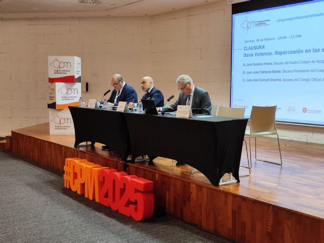 La última mesa del congreso ha analizado el tema de la "Dana Valencia. Repercusión en las empresas y en la sociedad". En esta última exposición han participado José Soriano, decano del Ilustre Colegio de Abogados de Valencia; Juan José Enríquez, decano-presidente del Colegio de Economistas de Valencia y Juan José Estruch, decano del Colegio Oficial de Titulares Mercantiles de Valencia.