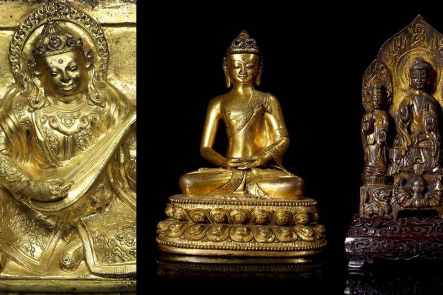 Figura de bronce dorado "Triada Budista" (lote 136), inspirada en el estilo Liao, con un precio de salida de 600 euros, representando a tres budas sobre un altar con relieves de leones.