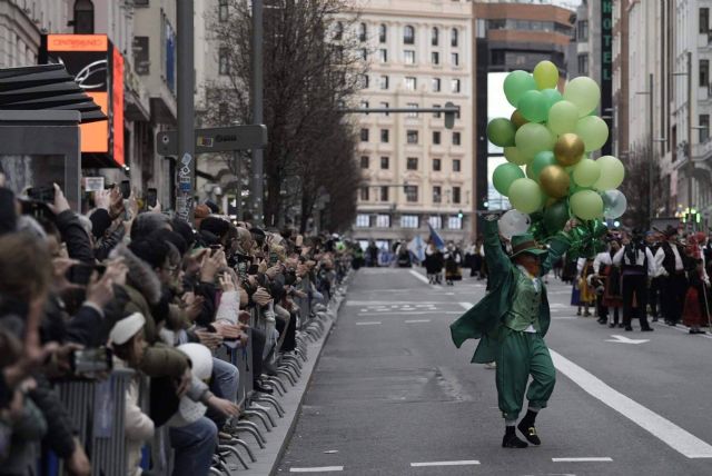 “San Patricio se ha sentido en cada rincón de la Gran Vía, desde el emblemático edificio Metrópolis, donde arrancó el desfile, hasta la Plaza de España, donde los más de 600 gaiteros pusieron la banda sonora a esta espectacular tarde de sábado en el corazón de Madrid” explican los organizadores.