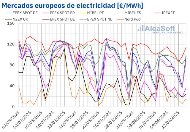 En la segunda semana de abril, los precios de los principales mercados eléctricos europeos se mantuvieron en el entorno de los de la semana anterior, con promedios ligeramente superiores en la mayoría de ellos. La excepción fue el mercado IPEX de Italia, que registró una caída del 10%. El mercado EPEX SPOT de los Países Bajos registró la mayor subida porcentual de precios, del 10%. En el resto de los mercados analizados en AleaSoft Energy Forecasting, los precios subieron entre el 0,8% del mercado EPEX SPOT de Francia y el 9,2% del mercado MIBEL de España.