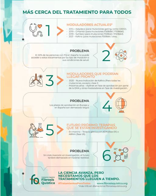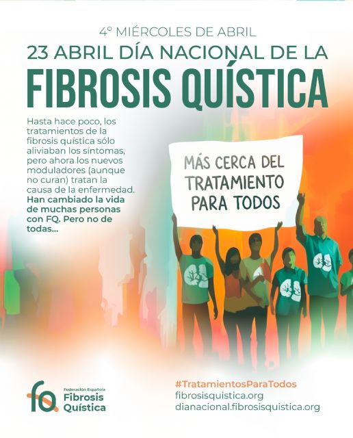 Con motivo del Día Nacional de la Fibrosis Quística, que tendrá lugar mañana 23 de abril (cuarto miércoles de abril) y bajo el lema "Más cerca del tratamiento para todos", la Federación Española de Fibrosis Quística (FEFQ) quiere poner el foco en la urgente necesidad de impulsar la investigación en enfermedades raras como la fibrosis quística y en la agilización de los procesos para la inclusión en el sistema sanitario público de los tratamientos ya aprobados a nivel europeo.