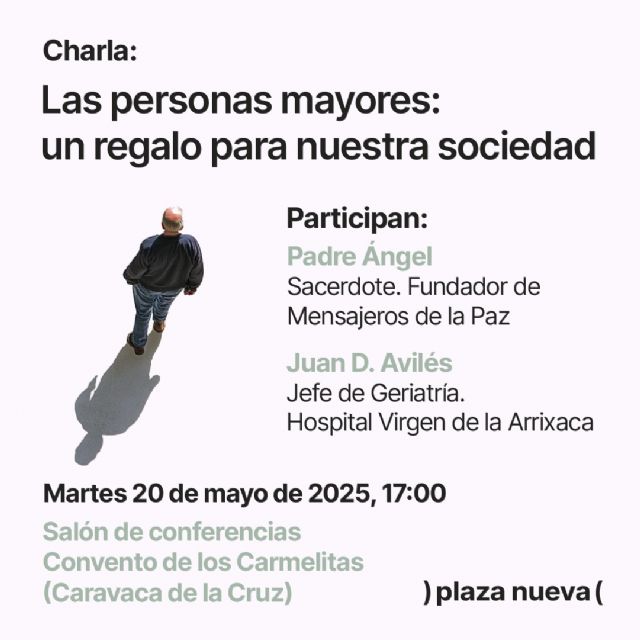 Dar visibilidad a los problemas derivados de la soledad no deseada y la falta de presencia y participación activa en la sociedad, son algunos de los objetivos sobre los que viene trabajando la asociación Plaza Nueva desde hace varios meses. El próximo martes 20 de mayo, a las cinco de la tarde, tendrá lugar una charla coloquio que con el título "Las personas mayores: un regalo para nuestra sociedad", en la que participarán el padre Ángel García, fundador de Mensajeros de la Paz; y Juan Dionisio Avilés, jefe de Geriatría del Hospital Virgen de la Arrixaca de Murcia.