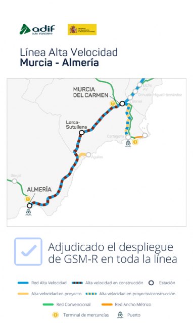 El Ministerio de Transportes y Movilidad Sostenible ha adjudicado por 30,5 millones de euros (IVA incluido) un contrato para el despliegue del sistema de comunicaciones móviles GSM-R en toda la Línea de Alta Velocidad (LAV) Murcia-Almería, incluyendo el ramal Pulpí-Águilas, con lo que se da un nuevo avance para desarrollar esta nueva infraestructura de 200 km.