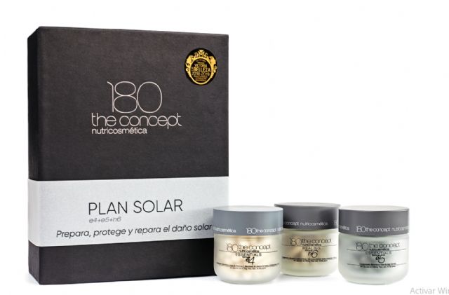 La firma nutricosmética 180 the concept cuenta con el Plan Solar de 180 the concept, un plan creado a partir de las fórmulas E4+E5+H6, destinado a preparar la piel y cuidarla para mejorar sus defensas y aumentar la tasa de melanina. Gracias a ello ayuda a restaurar los niveles de hidratación, regenerando los tejidos y favoreciendo un bronceado sano. A su vez, sus ingredientes actúan reduciendo la inflamación y el daño celular que se produce después de la exposición solar.