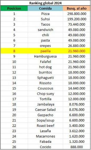 Durante la presentación, Javier Baixauli CEO de originalpaella, empresa especializada en la distribución y venta de paelleros, paelleras, equipamiento e ingredientes necesarios para poder realizar una paella en más de 120 países de todo el mundo, y autora del "Estudio Internacional de la Paella" que se realiza desde 2014, ha destacado datos que evidencian que "La paella es sin duda la punta de lanza de la gastronomía española y un estandarte de la dieta mediterránea, las búsquedas de la palabra paella se sitúan en más de 21.960.000 durante 2024 que frente a las 14.640.000 búsquedas anuales de 2023, representa un aumento de un 50% en el número de búsquedas y evidencia el gran interés a nivel global que suscita la receta, esto sitúa la paella dentro del ranking de los top 10 más buscados en internet a nivel mundial, concretamente en el 8ª puesto como se puede ver en la tabla adjunta".