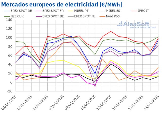 En la semana del 12 de mayo, los promedios semanales superaron los 60 €/MWh en la mayoría de los principales mercados eléctricos europeos. Las excepciones fueron los mercados español, nórdico, francés y portugués, cuyos promedios fueron de 18,19 €/MWh, 21,65 €/MWh, 23,10 €/MWh y 25,57 €/MWh, respectivamente. En cambio, los mercados británico e italiano alcanzaron los mayores promedios semanales, de 92,22 €/MWh y 95,80 €/MWh, respectivamente. En el resto de los mercados analizados, los precios estuvieron entre los 64,46 €/MWh del mercado belga y los 68,61 €/MWh del mercado alemán.