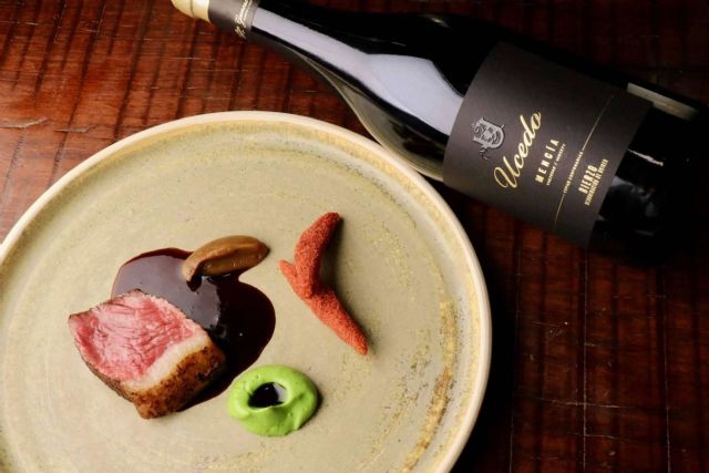 Cerraba el capítulo de los platos antes del postre el cocinero de Euskalduna Studio* con su `Picaña & plátano´, en armonía el vino tinto más importante de la bodega, Ucedo 2022 (Mencía), elaborado con uvas del viñedo Los Almendros, cepas centenarias, que pasaron por una fermentación alcohólica en abierto en depósitos de acero inoxidable y maloláctica en barrica de roble francés de primer uso. Un vino que es reconocido por su color cereza intenso, con notas minerales, pizarras, fruta negra silvestre además de alguna especia y regaliz, y que en boca es concentrado, denso, potente, con taninos muy presentes y dulces, que descubre confitura de frutas negras (cerezas).