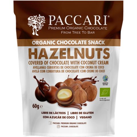 Avellanas cubiertas con chocolate: Con crema de coco ecológico, sin gluten y sin lactosa.