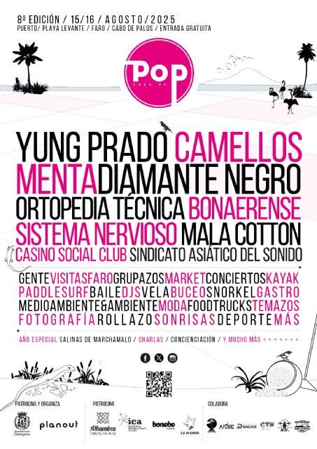 Cabo de Pop cuenta con el patrocinio del ICA, Instituto de las Industrias Culturales y las Artes de la Región de Murcia, Cervezas Alhambra, La Manga Consorcio y Bonobo.