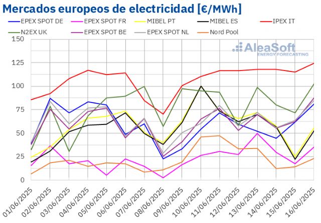 En la segunda semana de junio, los precios promedio de la mayoría de los principales mercados eléctricos europeos subieron respecto a la semana anterior. Las excepciones fueron los mercados neerlandés y alemán, con caídas del 0,3% y el 17%, respectivamente. En cambio, el mercado EPEX SPOT de Francia y el mercado Nord Pool de los países nórdicos alcanzaron las mayores subidas porcentuales de precios, del 65% y el 88%, respectivamente. En el resto de los mercados analizados en AleaSoft Energy Forecasting, los precios subieron entre el 1,7% del mercado EPEX SPOT de Bélgica y el 24% del mercado MIBEL de España.