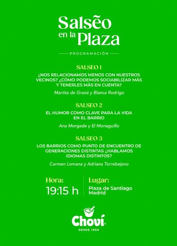 Las plazas siempre han sido el corazón de las ciudades y pueblos, lugares que históricamente han sido un punto de encuentro clave para todas las edades, que ha conectado y donde siempre se ha ‘salseado’. Para reivindicar estos espacios de encuentro, Choví presenta "Salseo en la plaza" un espacio que recrea en la Plaza de Santiago de Madrid un rincón donde rostros conocidos y público podrán darse cita para salsear. El encuentro, abierto al público, contará con las intervenciones de parejas a priori inesperadas.