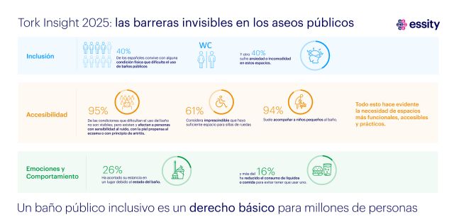 Essity, compañía global líder en productos y soluciones de higiene para la salud y el bienestar de las personas, ha identificado las barreras invisibles que dificultan o limitan el acceso a un aseo público*1. El estudio Tork Insight 2025 analiza la percepción de los españoles y determina que una mala experiencia en el baño puede generar disgusto (31%), incomodidad (31%) y decepción (23%).