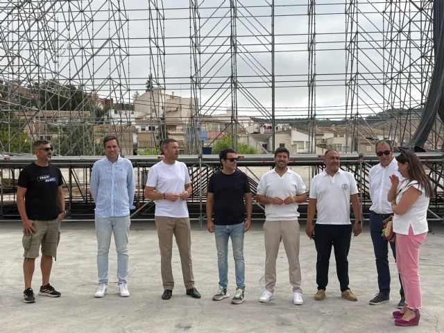 Representes de la Fundación Camino de la Cruz, el alcalde de Caravaca, José Francisco García; el concejal de Turismo, José Santiago Villa; el director del Instituto de las Industrias Culturales y las Artes de la Región de Murcia, Manuel Cebrián, y Diego Ferrón, de Crash Music, han visitado esta mañana el montaje en la explanada Salones del Castillo del escenario principal delfestival 'Las Noches del Camino', que regresa este fin de semana al municipio caravaqueño con artistas ybandas de referenciadel panorama musical nacional. Un evento musical al que se espera que asistan más de 5.000 personas este fin de semana.