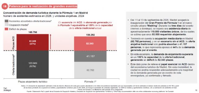 PwC apunta que esta oferta ha sido determinante para absorber la totalidad de la afluencia de grandes eventos como los conciertos de Taylor Swift y Duki, el festival Mad Cool o FITUR. De esta manera, sin los alojamientos de corta duración, la ciudad habría afrontado un déficit de hasta 20.000 plazas que el alojamiento tradicional no podría haber cubierto.