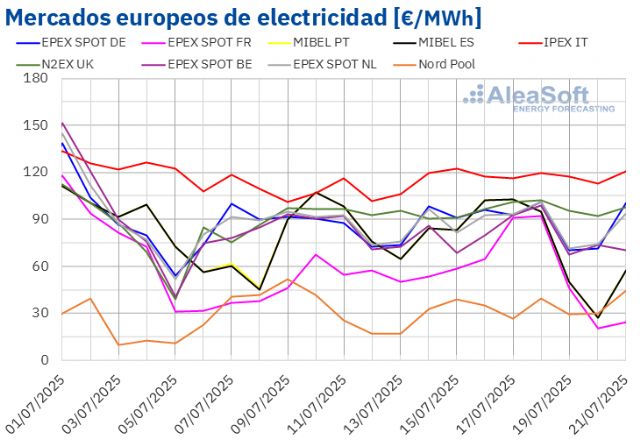 En la tercera semana de julio, los precios promedio de la mayoría de los principales mercados eléctricos europeos fueron superiores a los de la semana anterior. Las excepciones fueron el mercado Nord Pool de los países nórdicos y el mercado EPEX SPOT de Bélgica, donde los promedios semanales bajaron en un 1,3% y un 2,5%, respectivamente. El mercado EPEX SPOT de Francia experimentó el mayor incremento porcentual, con una subida del 22%. La subida en el mercado francés se concentró en los primeros días de la semana, mientras que durante el fin de semana se registró un descenso, alcanzándose el domingo el precio más bajo de la semana entre los principales mercados europeos. Por otro lado, el mercado EPEX SPOT de los Países Bajos registró la menor subida, con un 0,1%. En el resto de los mercados analizados en AleaSoft Energy Forecasting, los precios aumentaron entre el 0,2% en el mercado MIBEL de Portugal y el 8,8% en el mercado IPEX de Italia.