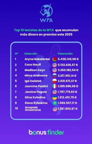 Aryna Sabalenka lidera el ranking de premios WTA 2025 con más de 5,4 millones de euros; Paula Badosa es la mejor española, en el puesto 16. Estados Unidos y Rusia dominan el top 30 de ganancias en el circuito femenino; BonusFinder revela el impacto económico del rendimiento deportivo en la WTA