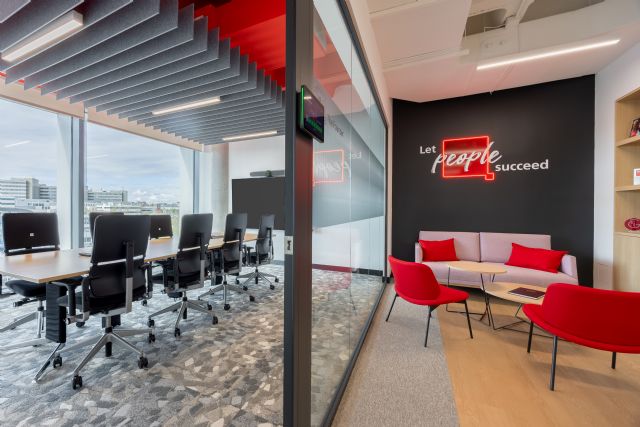 La planta, de más de 1.000 metros cuadrados, cuenta con diferentes espacios pensados para crear un entorno de colaboración abierto con todas las herramientas que necesitan los empleados, desde los puestos de trabajo, phone booths o estaciones privadas para llamadas, diferentes tipos de salas de reunión equipadas con tecnología de vanguardia basada en inteligencia artificial, ágoras o cantina conectada a cartelería digital para potenciar la comunicación corporativa y los eventos híbridos taquillas inteligentes, pantallas interactivas, etc.