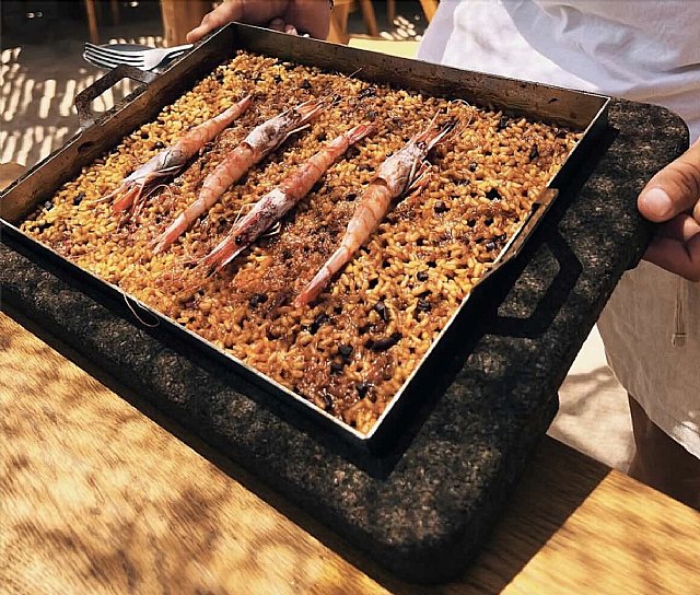 Los arroces, preparados al momento, son una de las especialidades de la casa. Destacan el arroz negro de calamar a la brasa en leña de naranjo, de sabor profundo y textura sedosa; el arroz del senyoret con gamba roja, limpio y elegante, o el sorprendente arroz con tataki de vaca vieja madurada 90 días, que marida mar y tierra bajo el sello del humo.