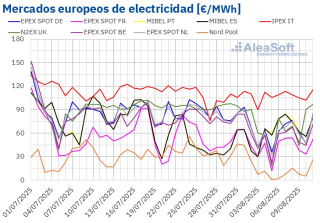 Por lo que respecta a los precios diarios, el martes 5 de agosto, la mayoría de los mercados registraron sus precios diarios más bajos de la semana, manteniéndose por debajo de 40 €/MWh, influenciados por niveles elevados de producción eólica. Ese día, el mercado nórdico alcanzó el menor promedio de la semana entre los mercados analizados, de 0,92 €/MWh. Por otra parte, los precios diarios del mercado italiano se mantuvieron por encima de 100 €/MWh durante la primera semana de agosto. El jueves 7 de agosto el mercado italiano alcanzó el promedio diario más elevado de la semana, de 113,20 €/MWh.