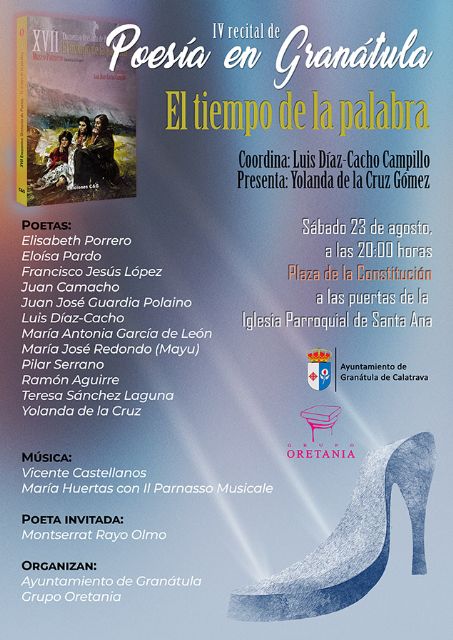 Organizado por el Ayuntamiento de Granátula de Calatrava y el Grupo Oretania, en el penúltimo sábado de agosto, día 23 de agosto a las 20:00 horas, a las puertas de la Iglesia Parroquial de Santa Ana, en la cuarta edición de 'Poesía en Granátula', se darán cita doce de esos veintiocho poetas: Elisabeth Porrero, Eloísa Pardo, Francisco Jesús López, Juan Camacho, Juan José Guardia Polaino, Luis Díaz-Cacho, María Antonia García de León, María José Redondo (Mayu), Pilar Serrano, Ramón Aguirre, Teresa Sánchez Laguna y Yolanda de la Cruz. La música vendrá de la mano de Vicente Castellanos y de María Huertas con Il Parnasso Musicale. Y como poeta invitada so contará con Montserrat Rayo Olmo.