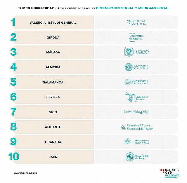 Las universidades más destacadas por su compromiso social y medioambiental son València- Estudi General, Girona, Málaga, Almería, Salamanca, Sevilla, Vigo, Alicante, Granada y Jaén.
