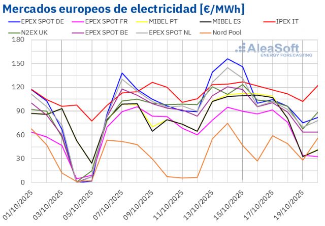 En la tercera semana de octubre, los precios promedio de los principales mercados eléctricos europeos subieron respecto a la semana anterior. El mercado EPEX SPOT de Francia registró el menor aumento de precios, de solo el 0,4%. En cambio, el mercado Nord Pool de los países nórdicos alcanzó la mayor subida porcentual de precios, del 68%. En el resto de los mercados analizados en AleaSoft Energy Forecasting, los precios subieron entre el 2,5% del mercado EPEX SPOT de Bélgica y el 17% del mercado MIBEL de Portugal.