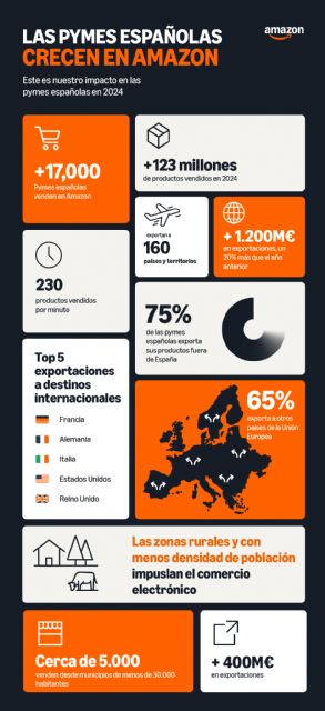 Amazon ha dado a conocer hoy los datos sobre su impacto en las pymes españolas durante 2024, que destacan el éxito y expansión de las más de 17.000 pequeñas y medianas empresas que han superado los 1.200 millones de euros en exportaciones, un incremento de más del 20% con respecto al año anterior.