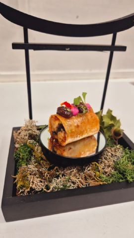 Con ‘Arima’, Garín conjuga la cocina medieval con una mirada contemporánea, siempre fiel al producto de cercanía. El plato tiene su origen en el conejo, ingrediente principal y símbolo de una historia familiar muy arraigada. Así, el pincho es un homenaje a su padre, Jesús Garin, fallecido hace un año, que fue cunicultor. A partir de ese recuerdo, Iban Garín construye un pincho que une oficio y sensibilidad: un conejo marcado a la brasa, confitado y desmigado, que se convierte en el núcleo de un cilindro relleno de duxelle de seta portobello y trufa. El conjunto se envuelve en una capa de papada ibérica ahumada y otra de pasta filo, horneada hasta conseguir una textura fina y crujiente.